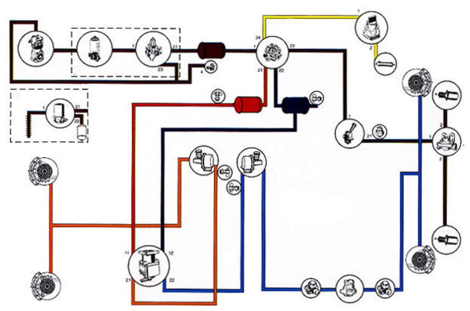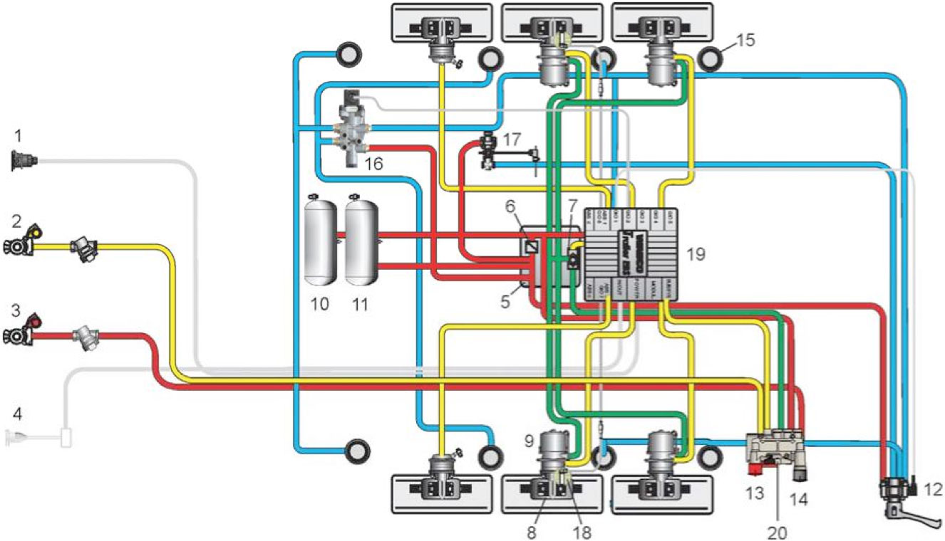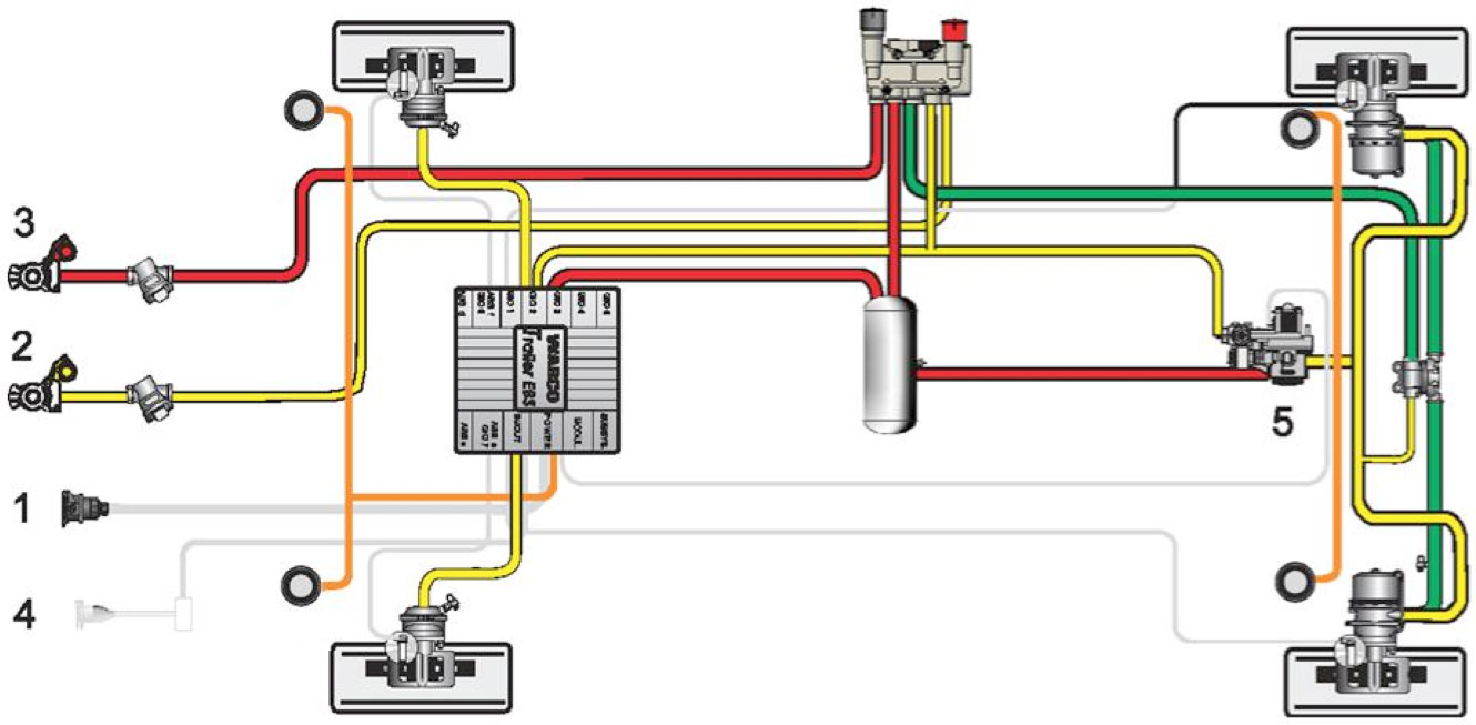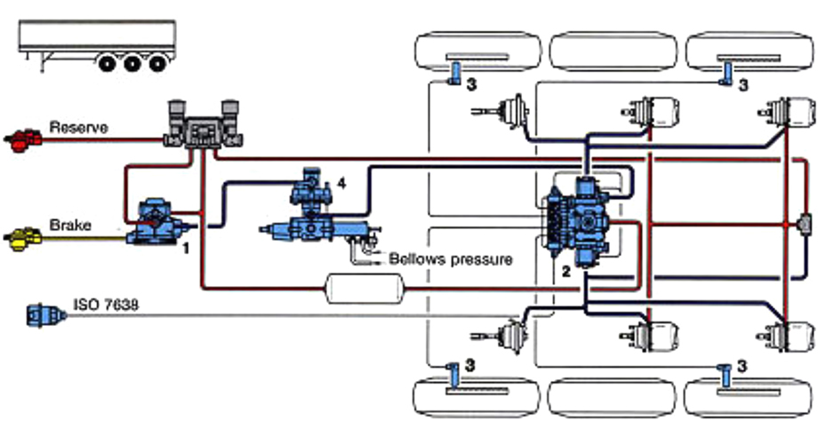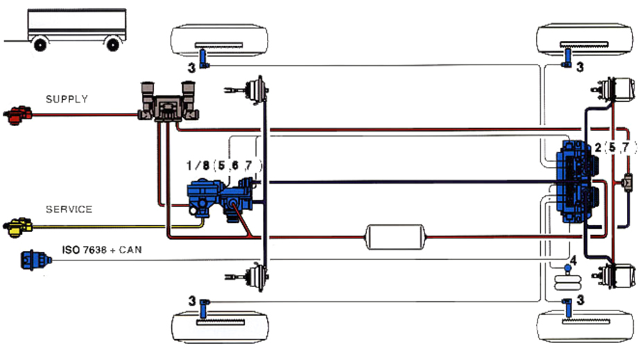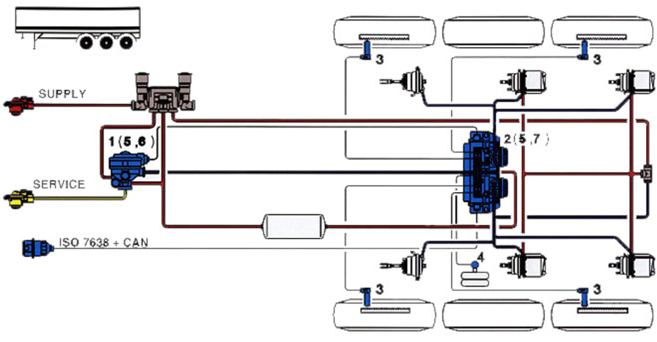 Questa configurazione per un tipico semirimorchio, a seconda della quantità di sensori di velocità, viene denominata sistema 2S/2M o 4S/2M.